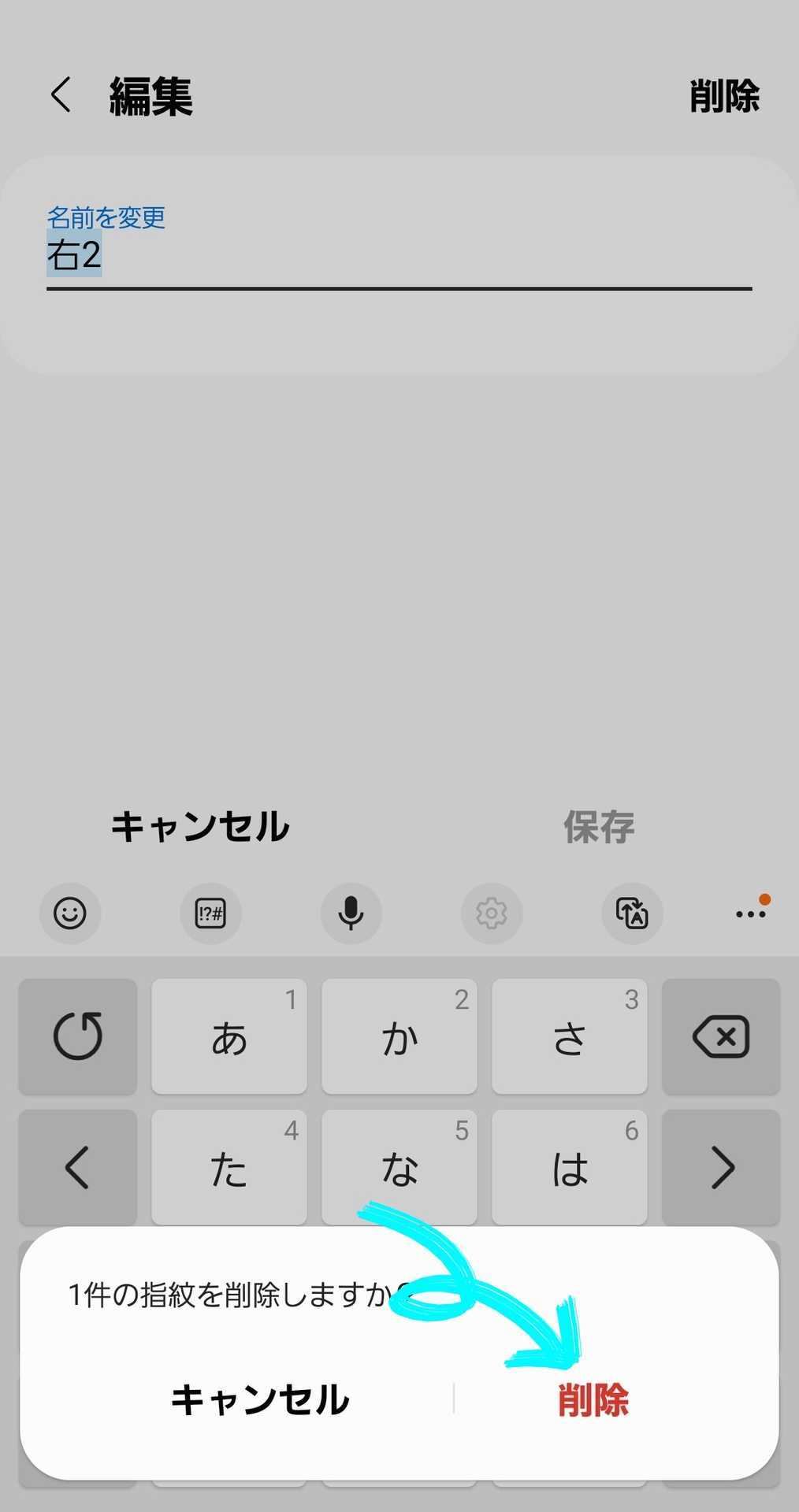 登録した指紋「右2」をタップし、「削除」をタップします。
