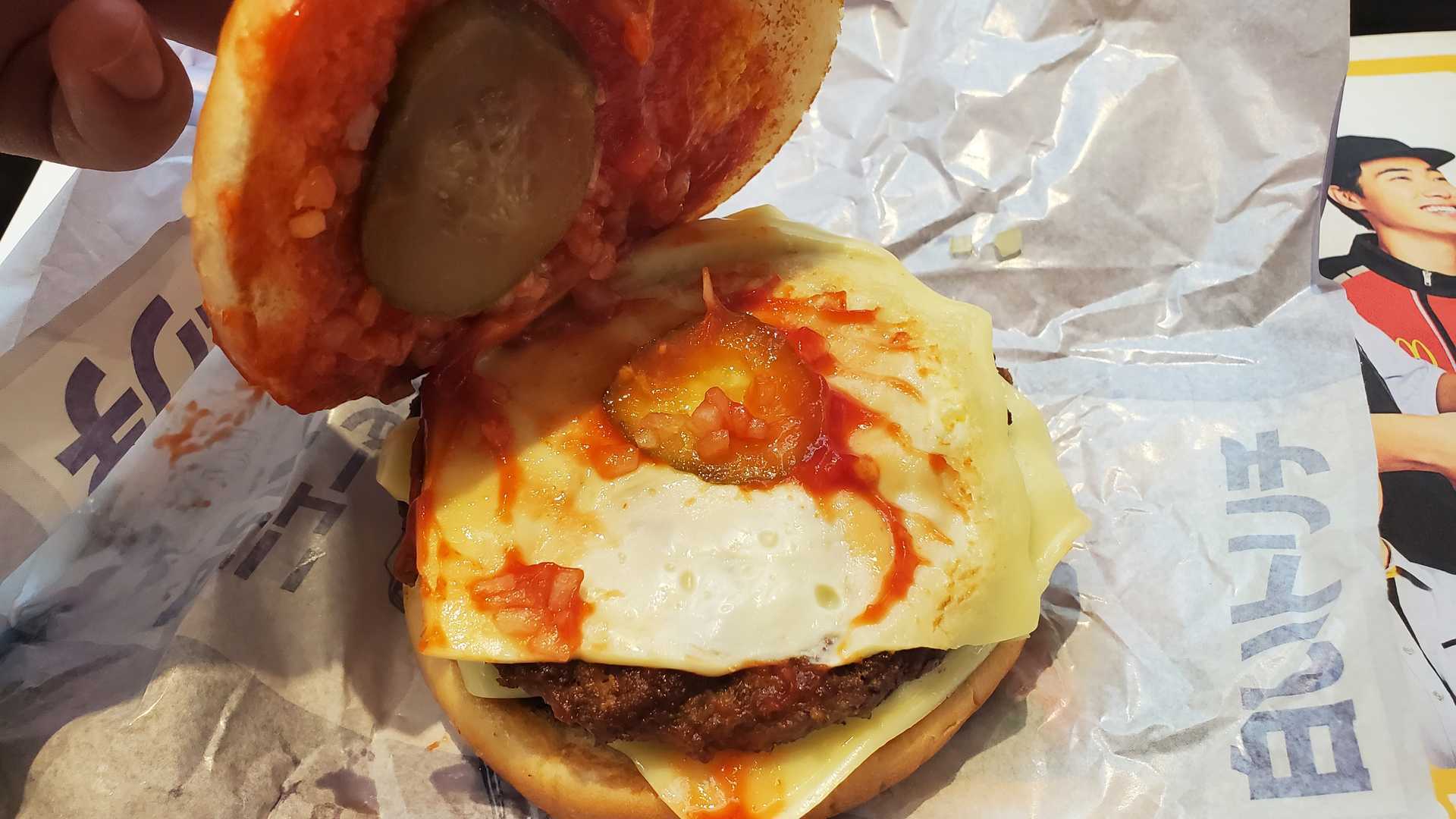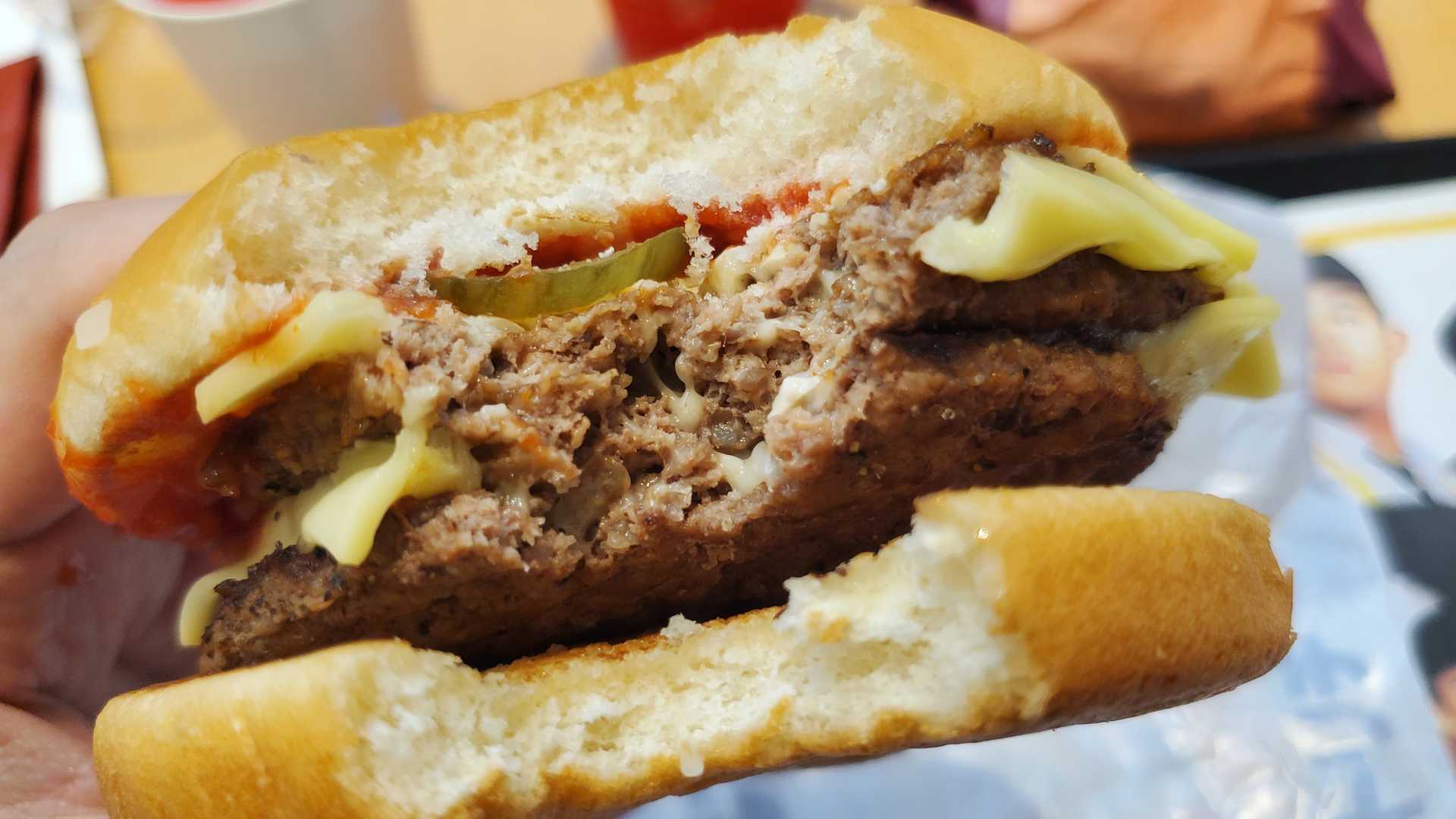 二口目からはビーフパティやチーズの3枚重ねとともに、ピクルスやオニオン、ケチャップなどが本格参戦してきます。