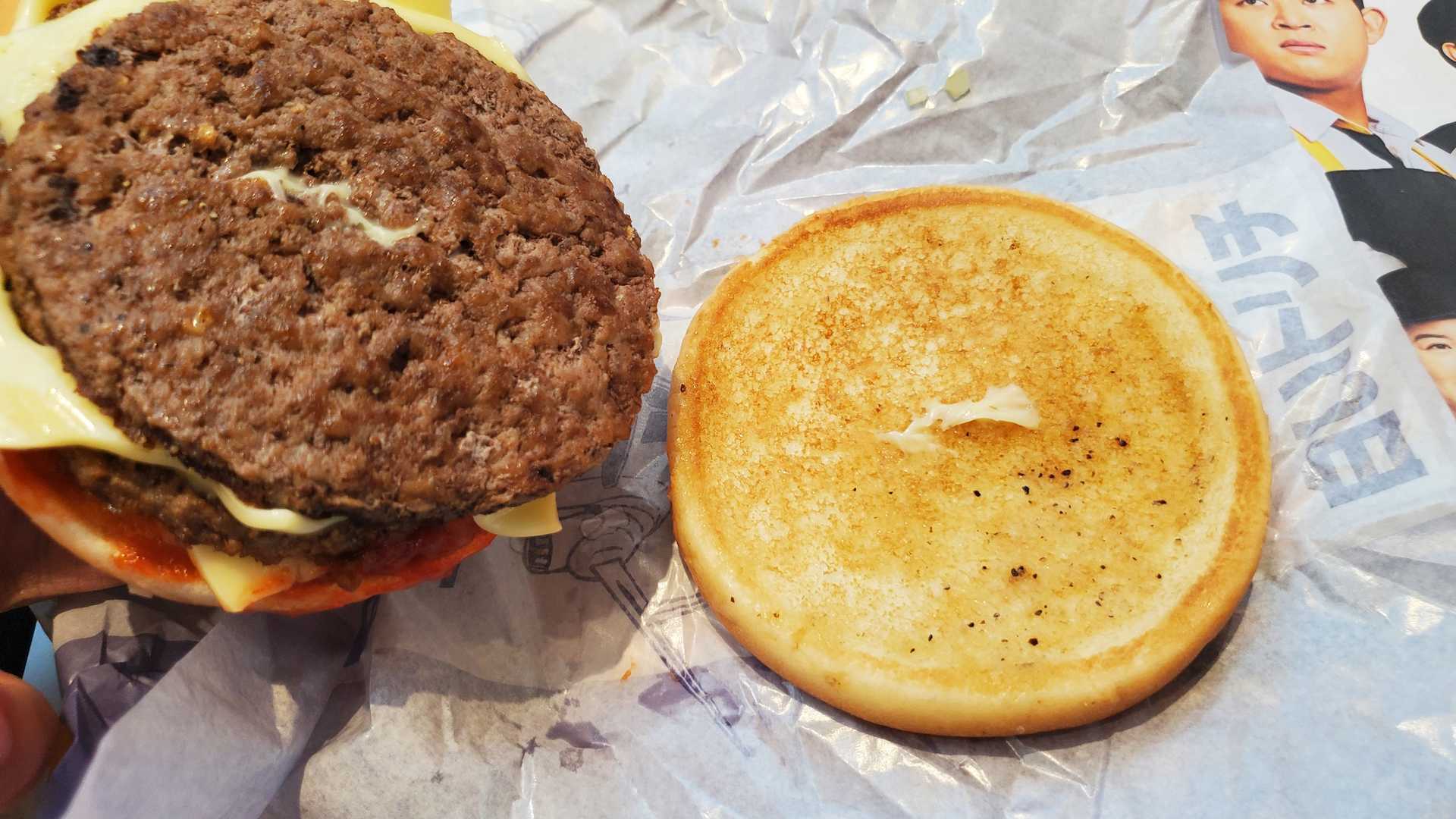 具材自体はシンプルな構成ですが、注目すべきはそのボリュームです。ビーフパティ3枚にクリーミーなホワイトチェダーチーズ3枚、これはなかなか重めなハンバーガーとなりそうです。