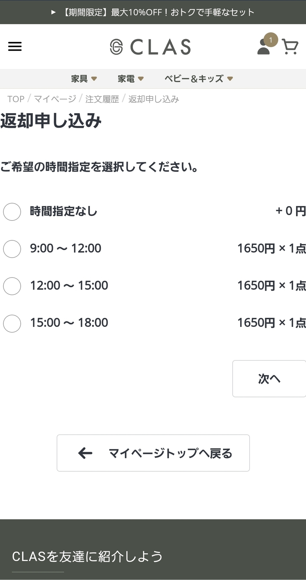 上記画面は照明器具をレンタルした時の返却画面ですが、時間指定をした場合、1点につき1,650円の手数料が発生するとなっています。