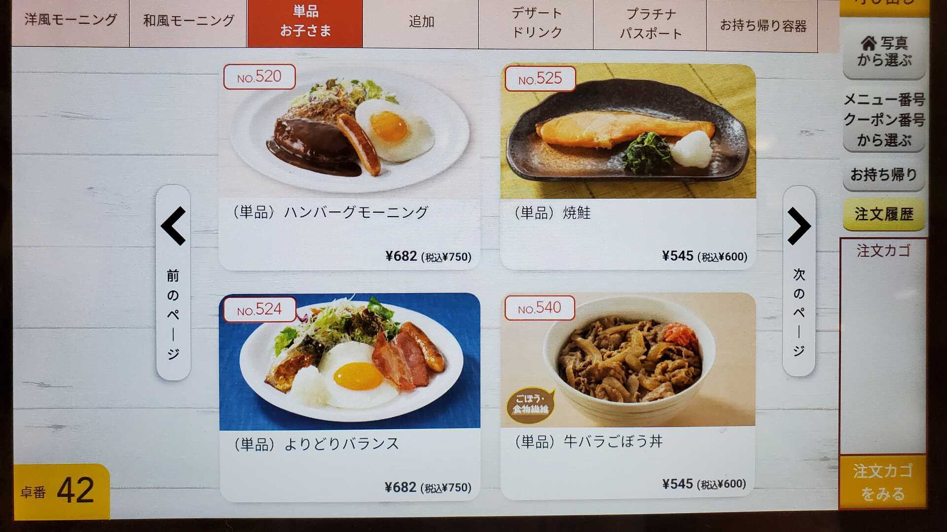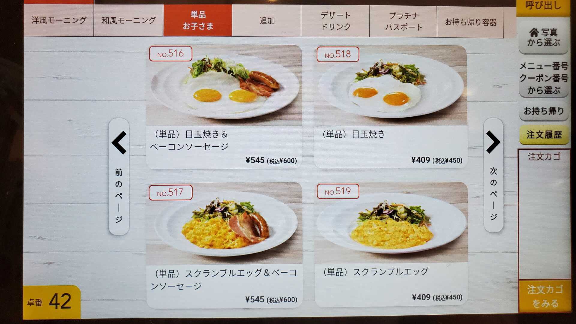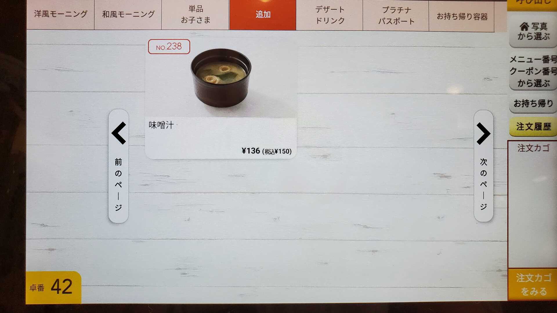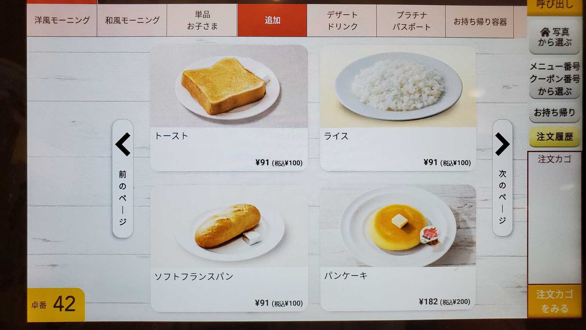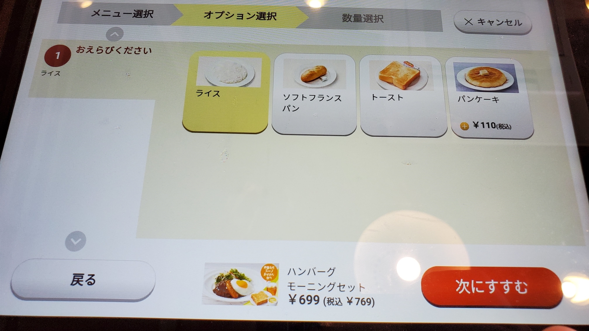 任意のモーニングメニューをタッチし、オプション(ライス、ソフトフランスパン、トースト、パンケーキ)を選択、注文カゴへ入れた後、注文を確定することで注文が完了します。
