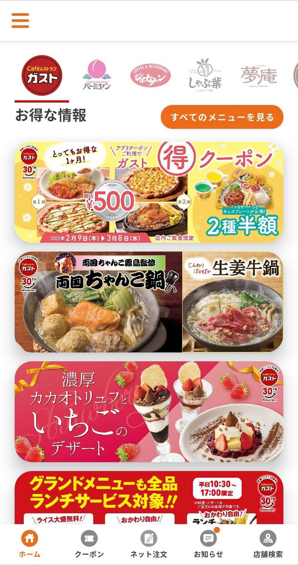 ガストは「すかいらーくグループ」の外食チェーンとなりますので、すかいらーくアプリで定期的にクーポン券を配布しています。