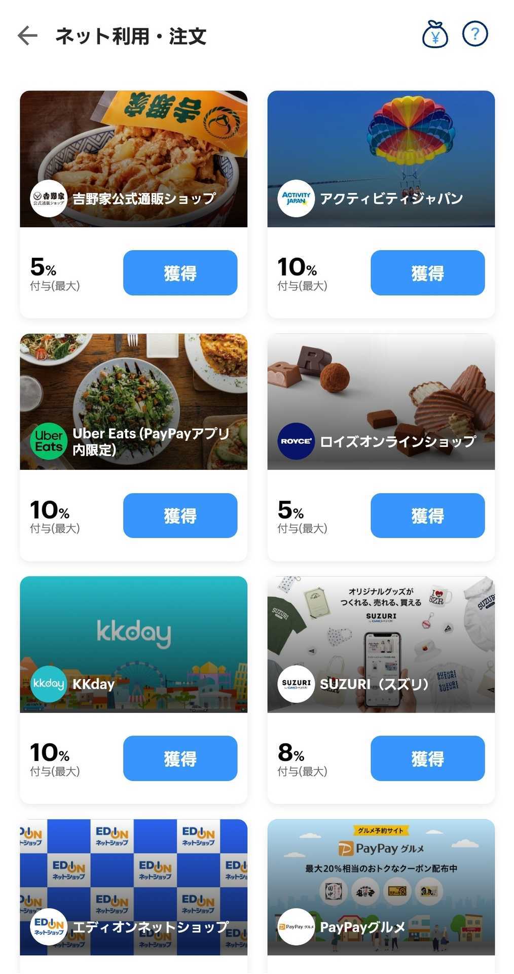 PayPayクーポン対象の通販サイトが表示されるので、クーポンを獲得したい通販サイトをタップしてください。