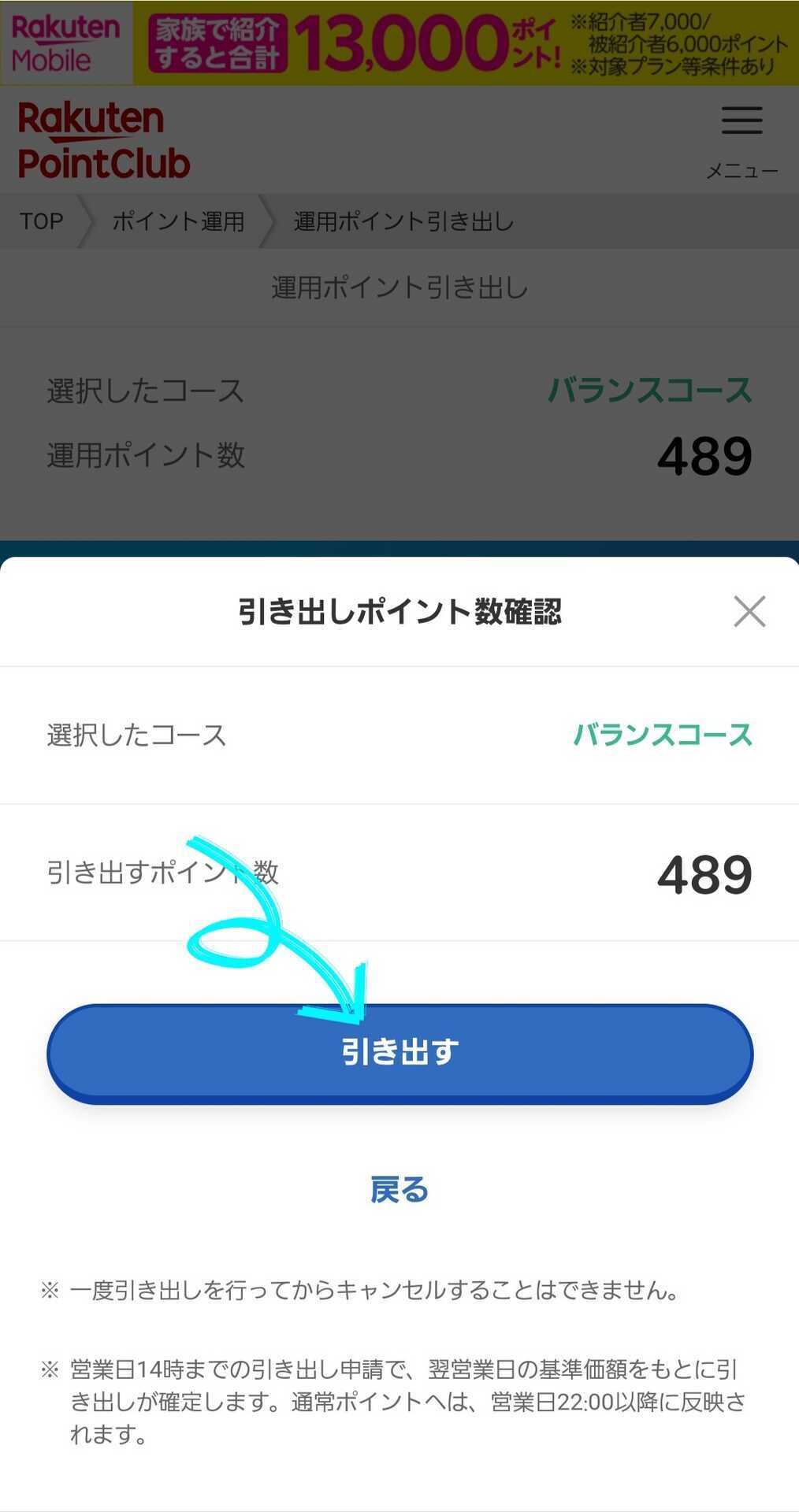 引き出すポイントを指定すると、以下のように確認画面が出てきますので、「引き出す」をタップします。